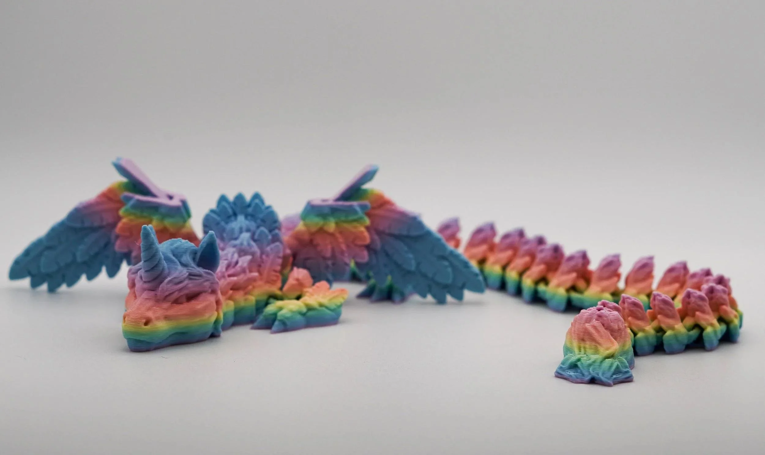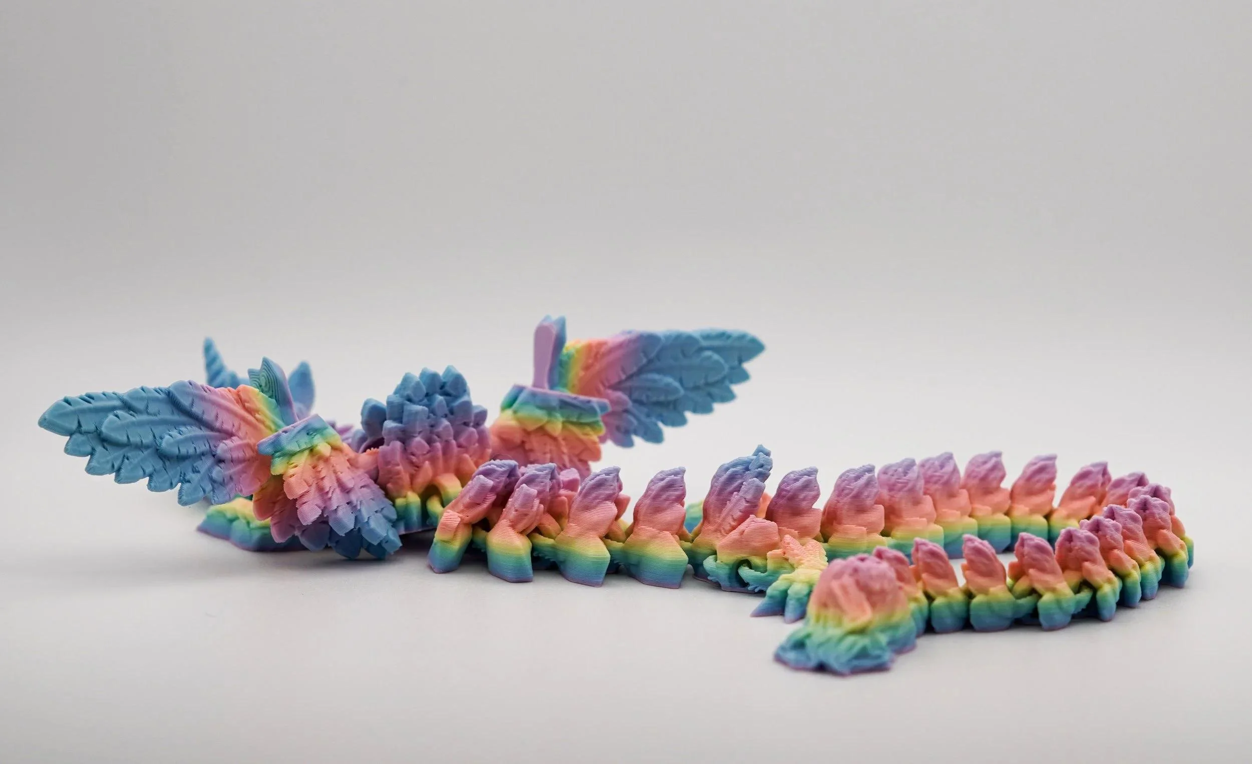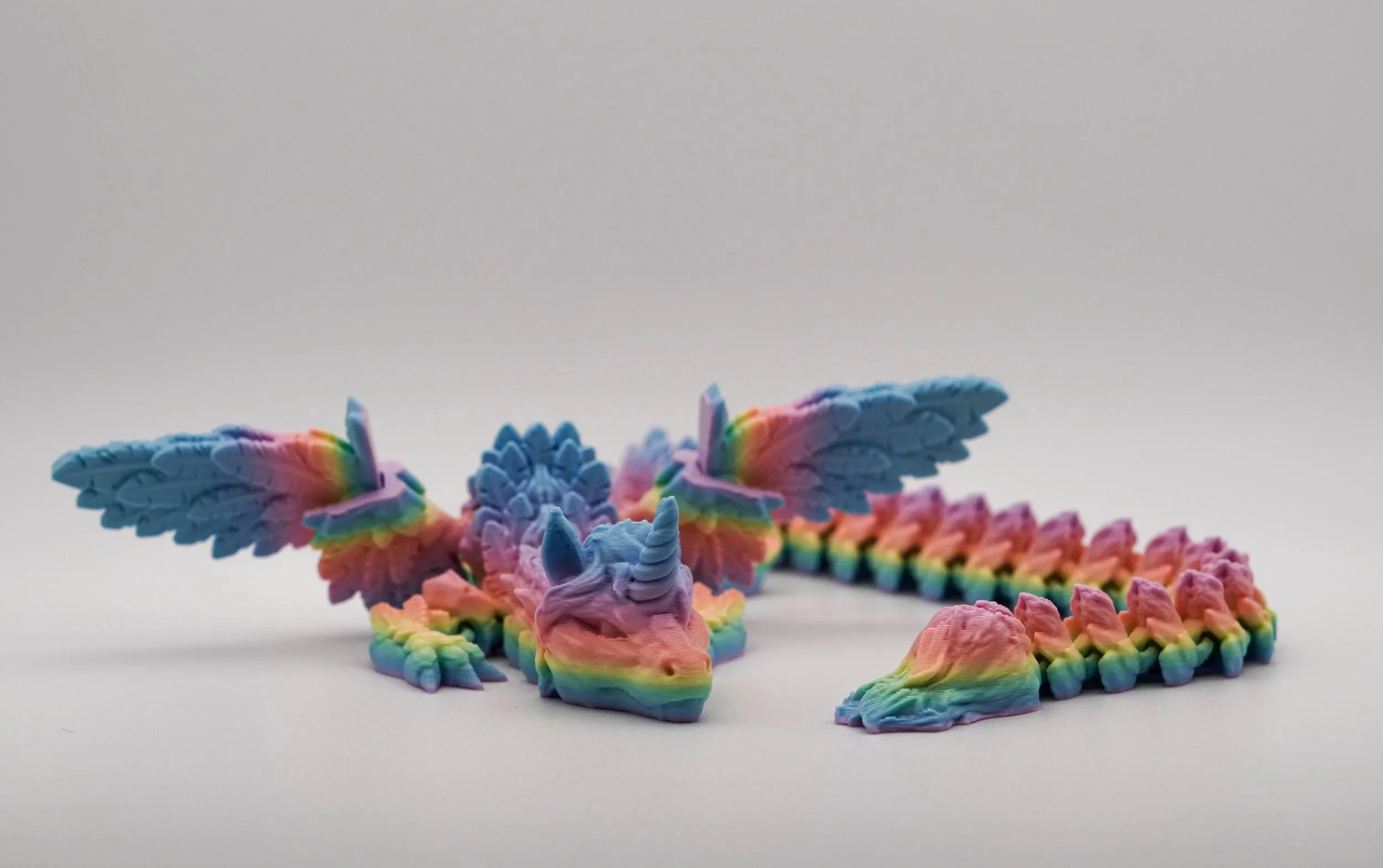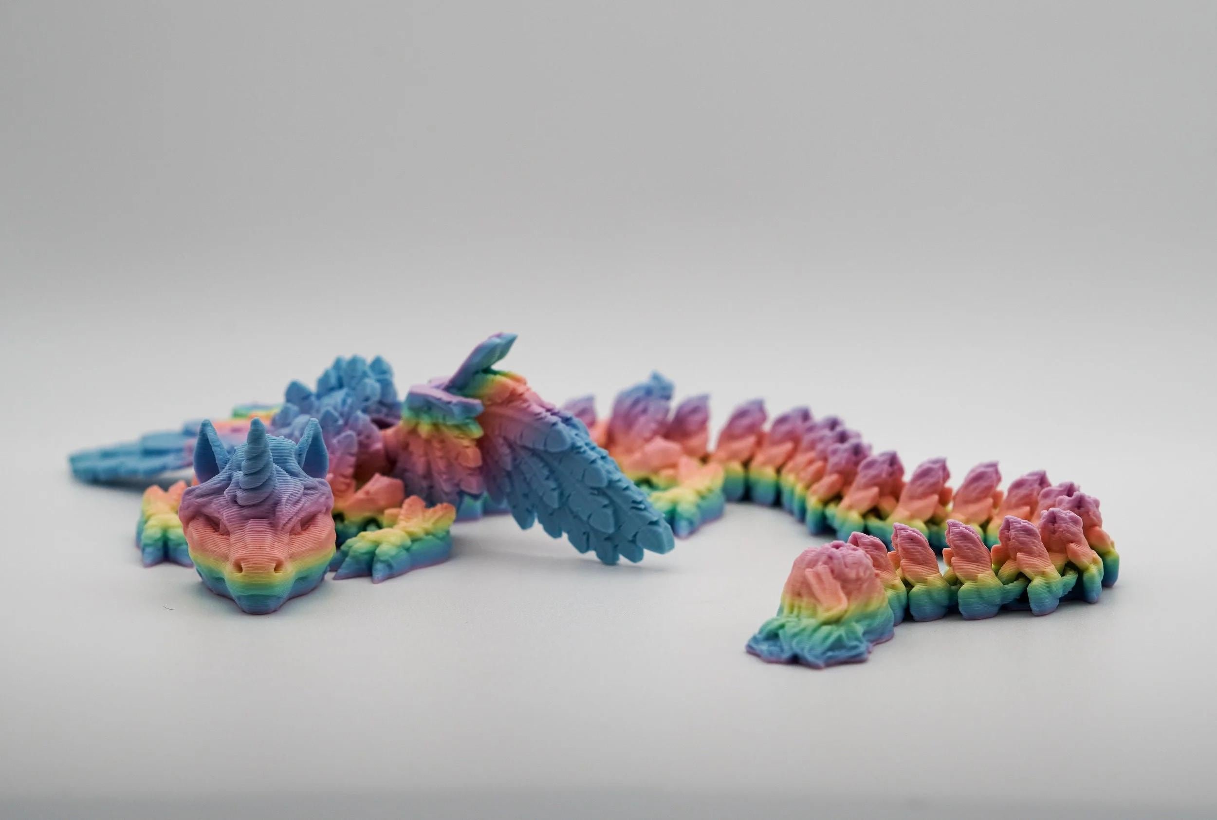 Unleash the magic with this stunning articulated Alicorn Dragon! Crafted in a vibrant pastel rainbow filament, this mythical creature combines the elegance of a unicorn with the majesty of a dragon. Featuring intricate wings, a flowing mane, and a fully posable segmented body, it’s both a mesmerizing display piece and a fun fidget toy. Perfect for fantasy lovers, collectors, or anyone who loves a touch of magic in their space! Designed by Cinderwing3D