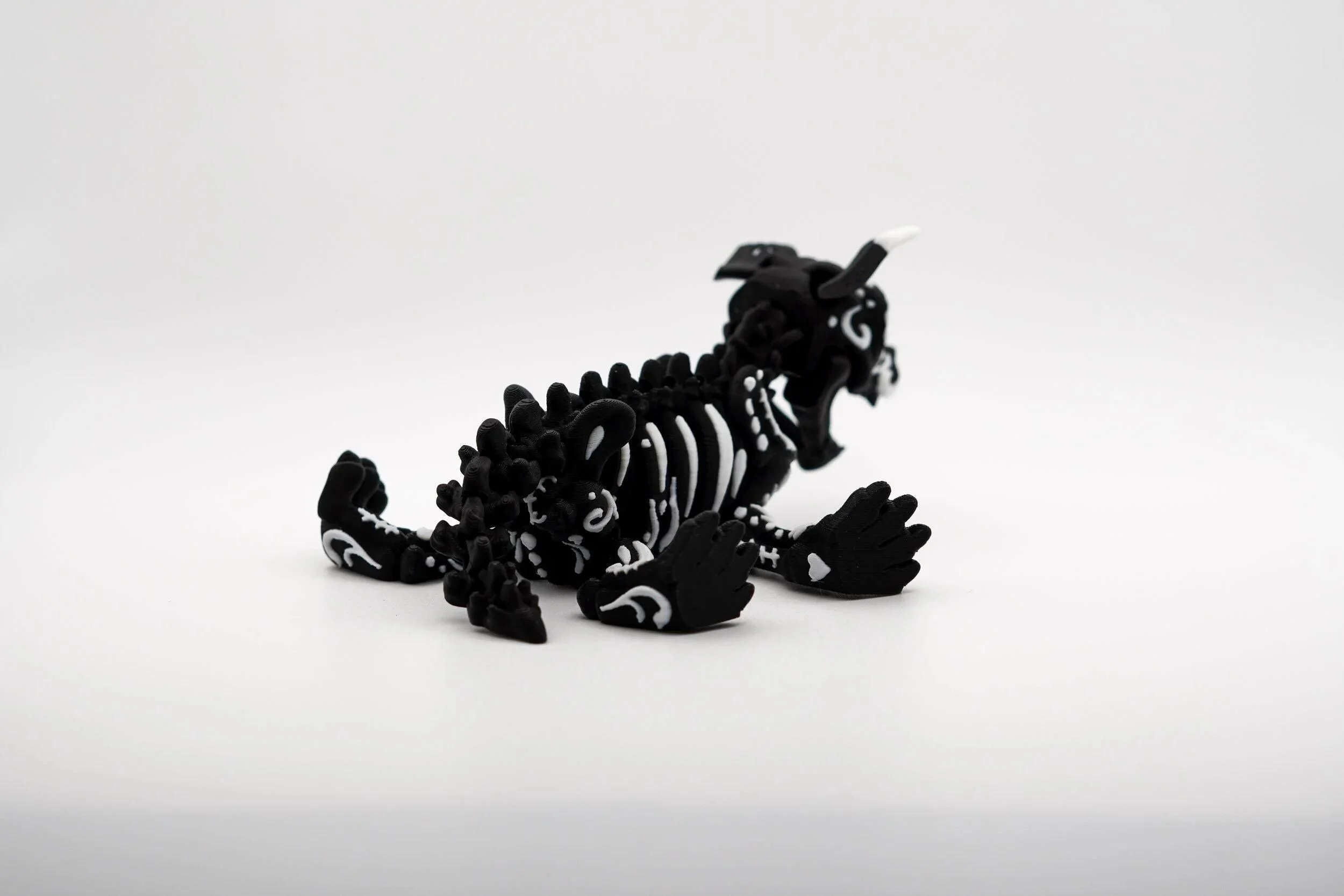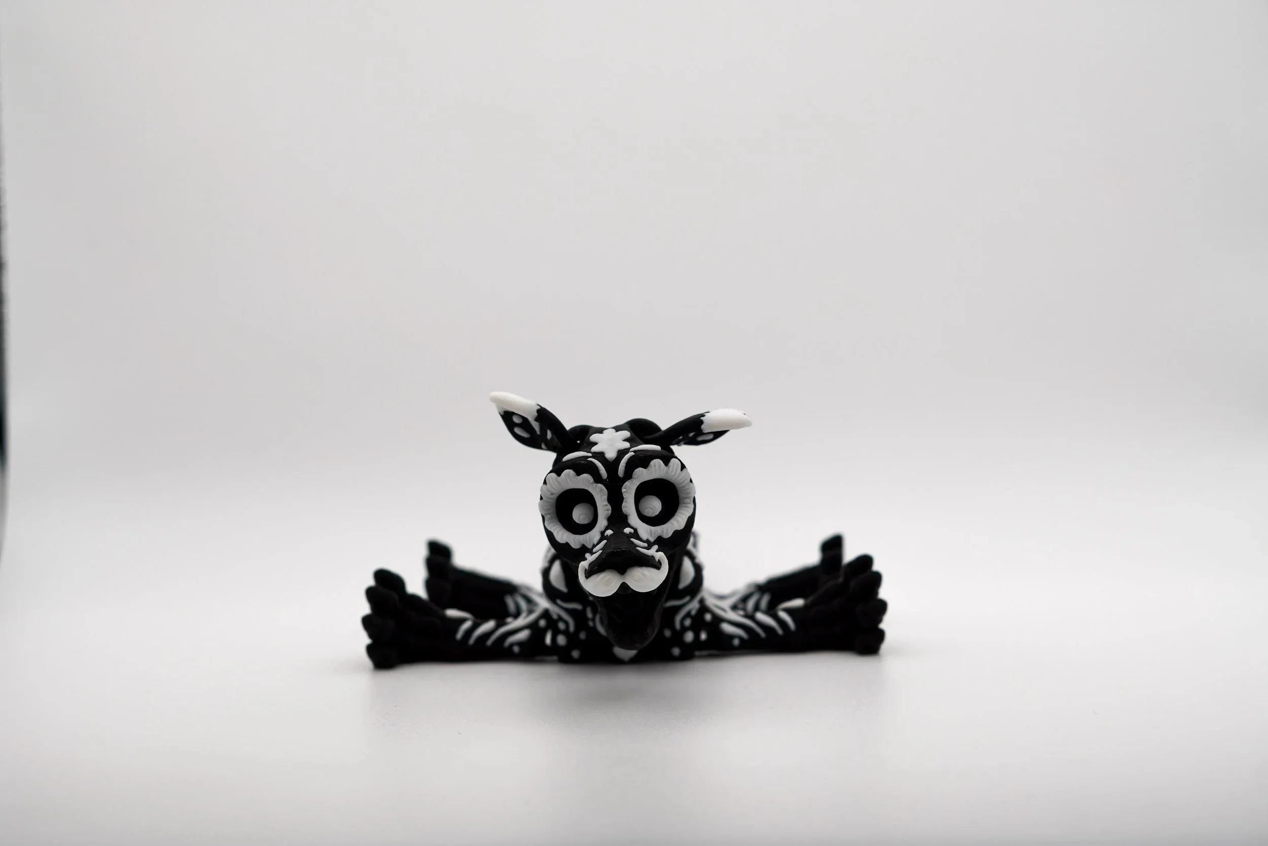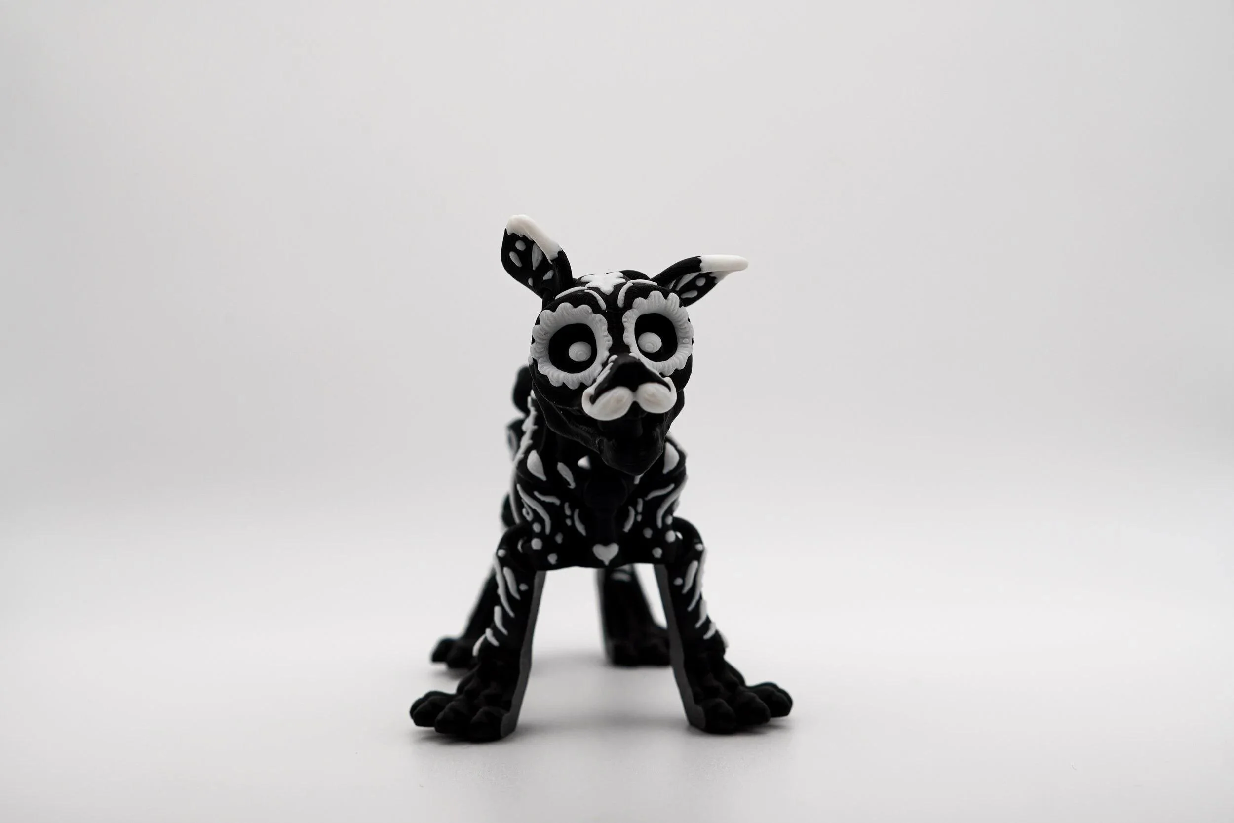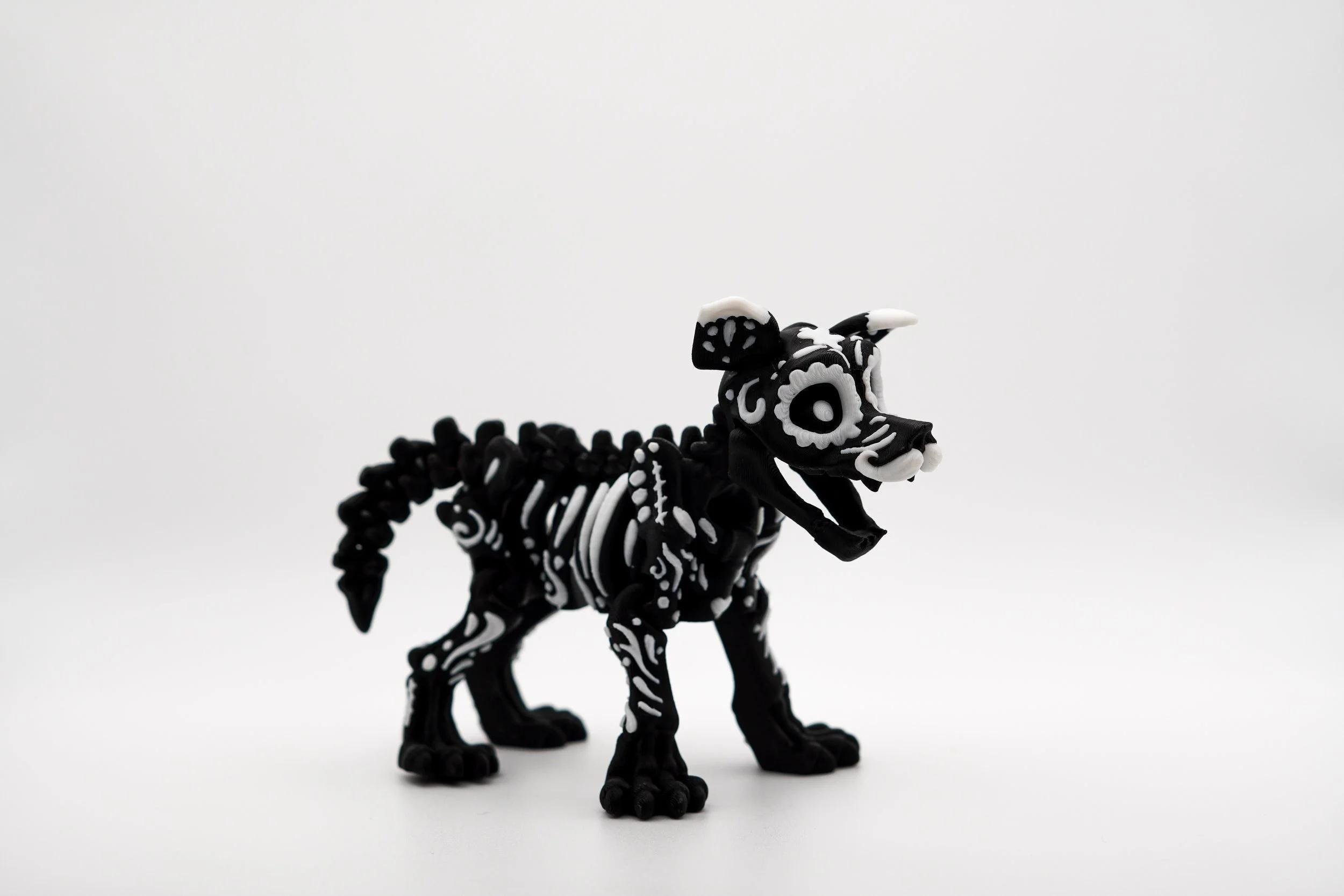 Unleash the spirit of the afterlife with this mesmerizing Sugar Skull Dog, a stunning 3D-printed tribute to Día de los Muertos (Day of the Dead). With its intricate skeletal details, vibrant black-and-white contrast, and beautifully painted bone-like patterns, this piece embodies both elegance and mystique. Whether you love sugar skull art, gothic aesthetics, or unique collectibles, this articulated dog is a must-have addition to your collection. Celebrate the fusion of tradition, artistry, and canine loyalty with this one-of-a-kind Sugar Skull Dog!