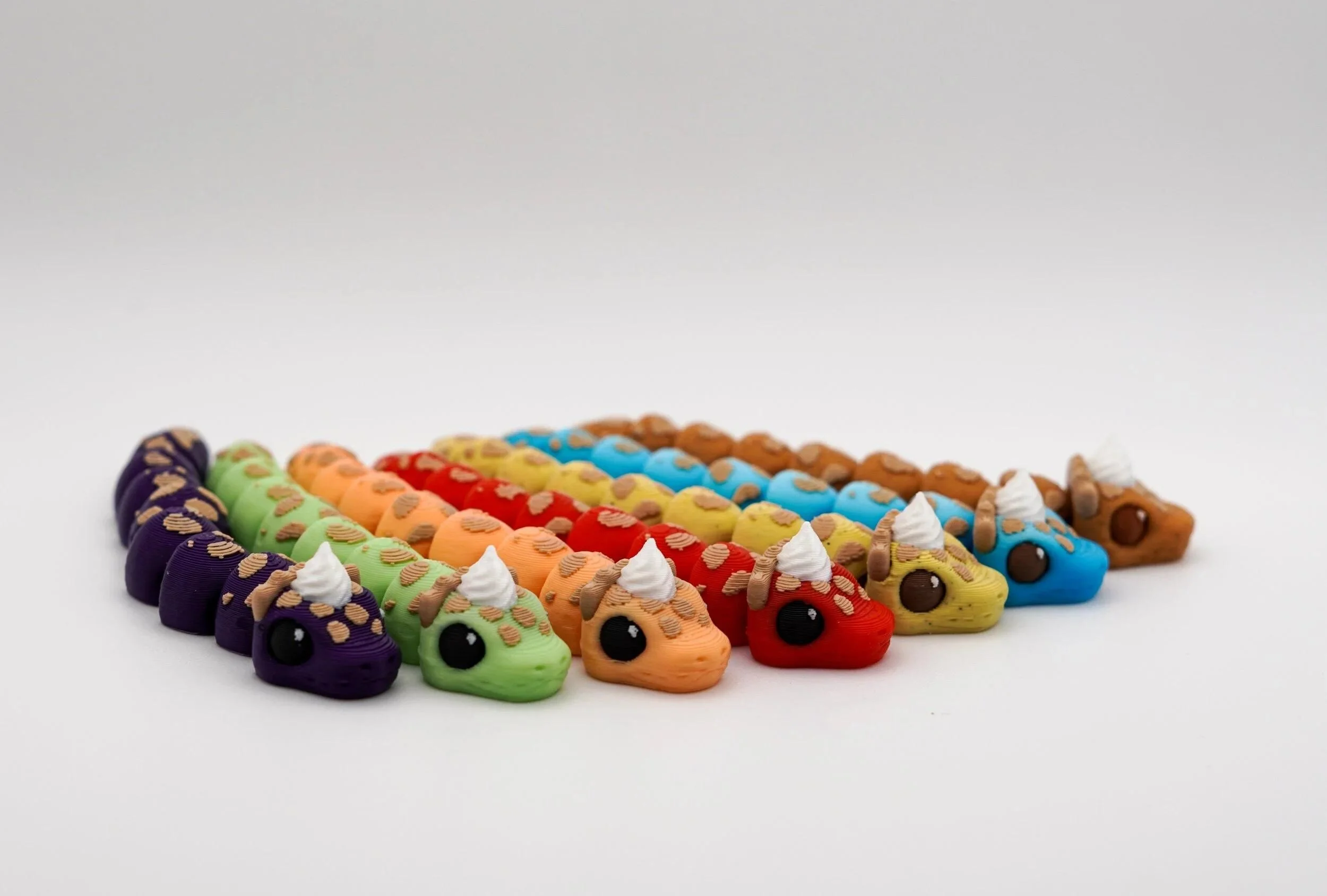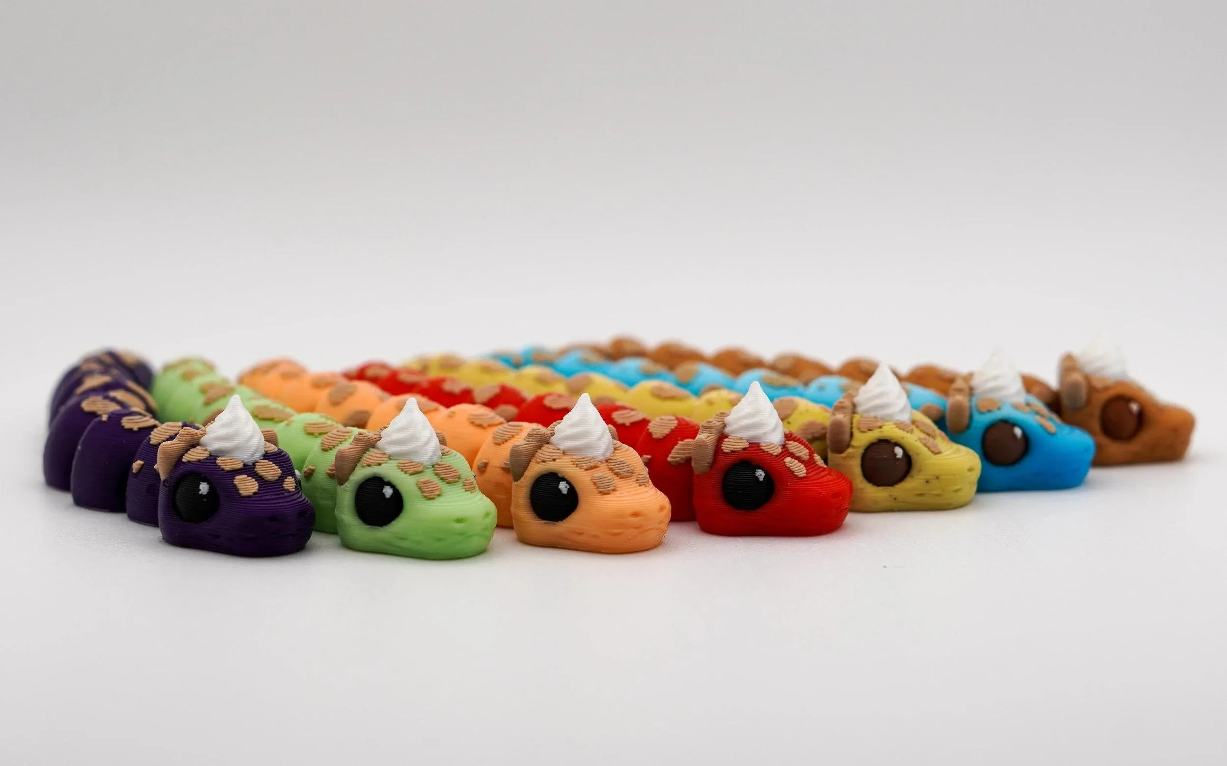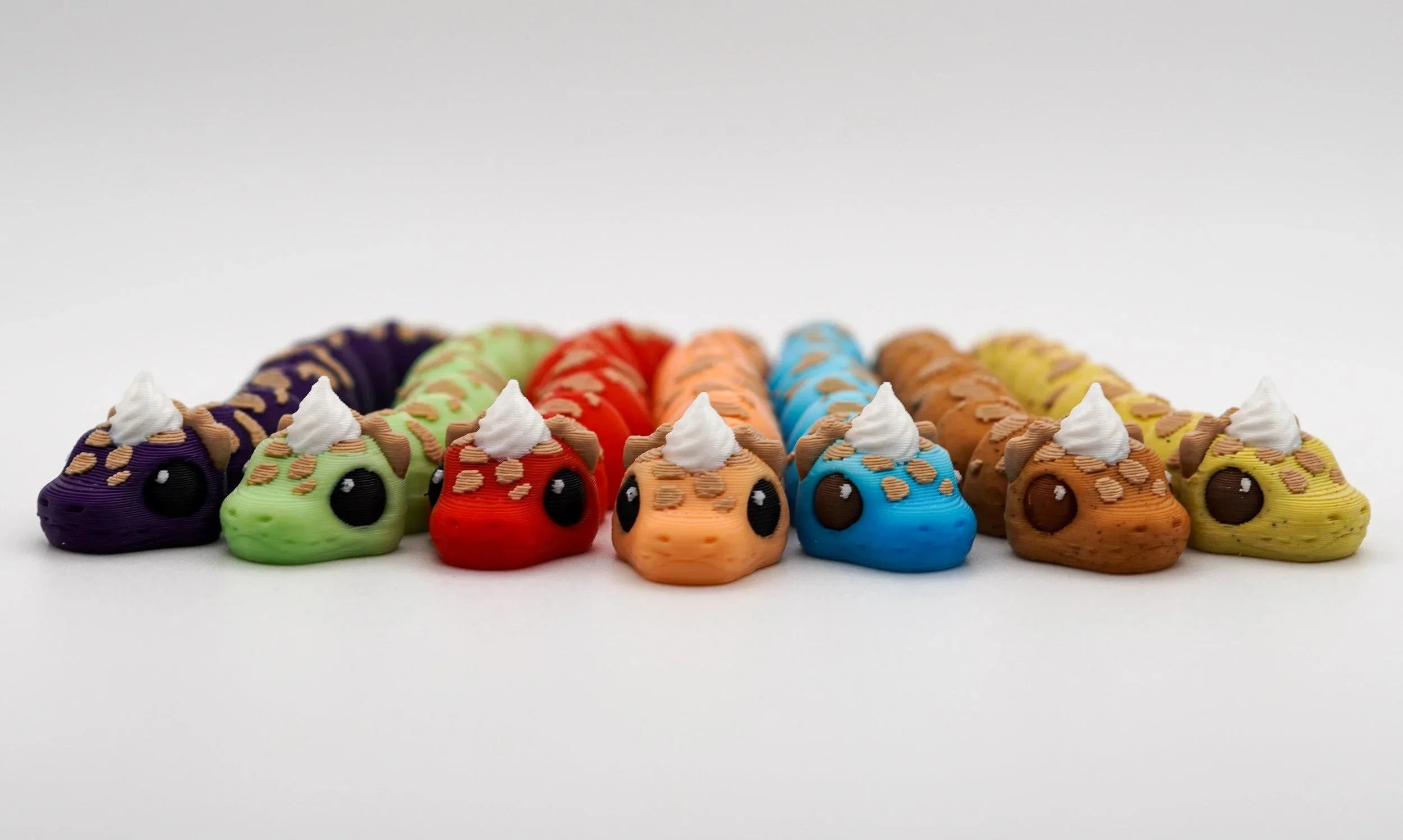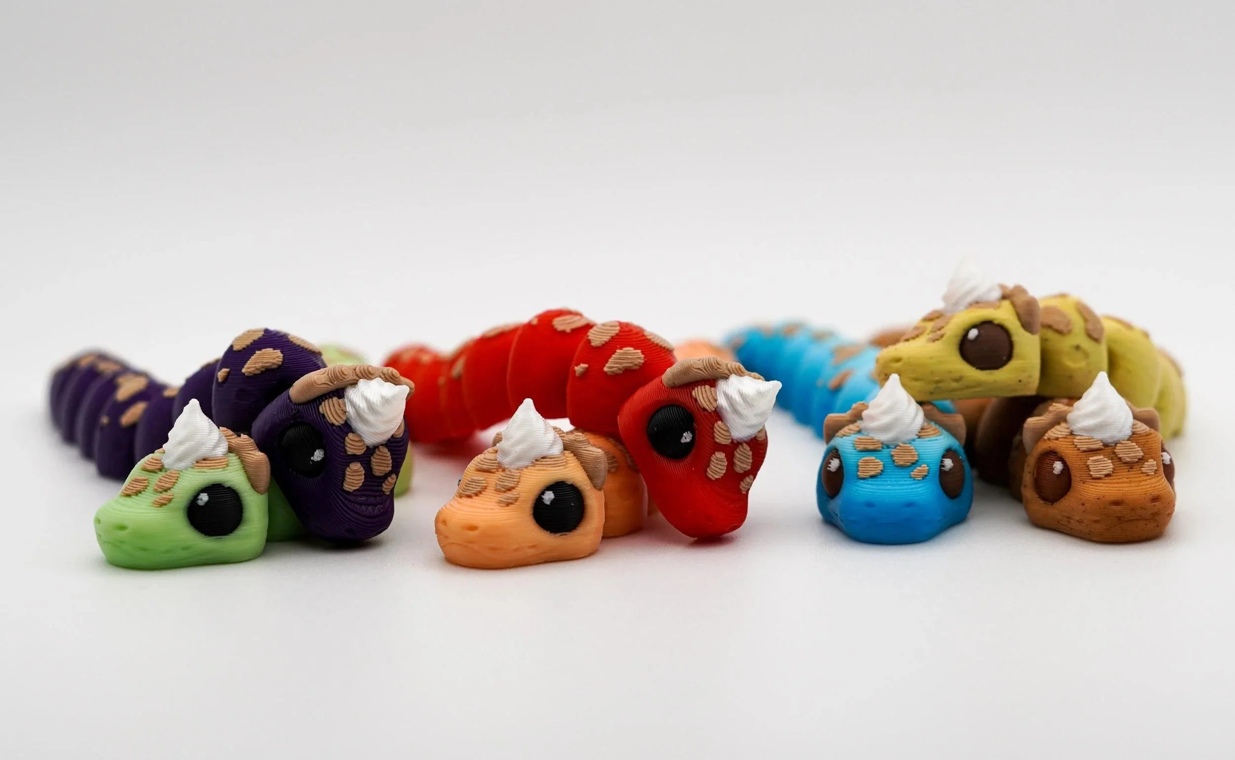 A delightful collection of handcrafted PIEthons—adorable, pie-themed snake figurines with a whimsical touch! Each PIEthon features a unique blend of vibrant colors and pie-inspired details, complete with a cute dollop of whipped cream on their heads. Designed by SugarPaws3D